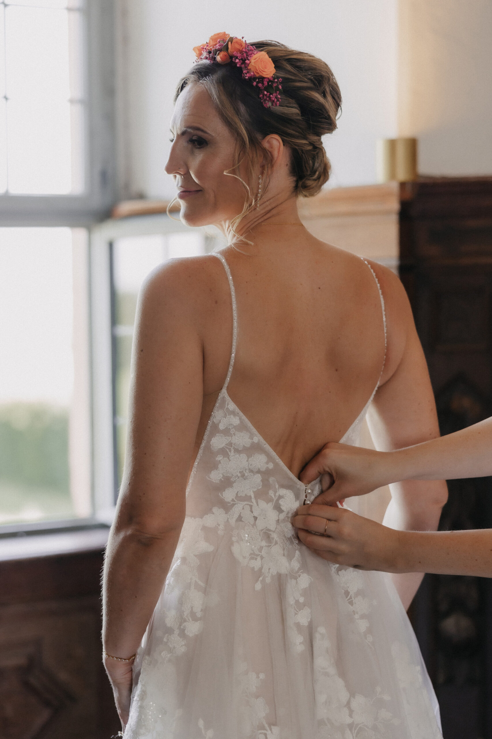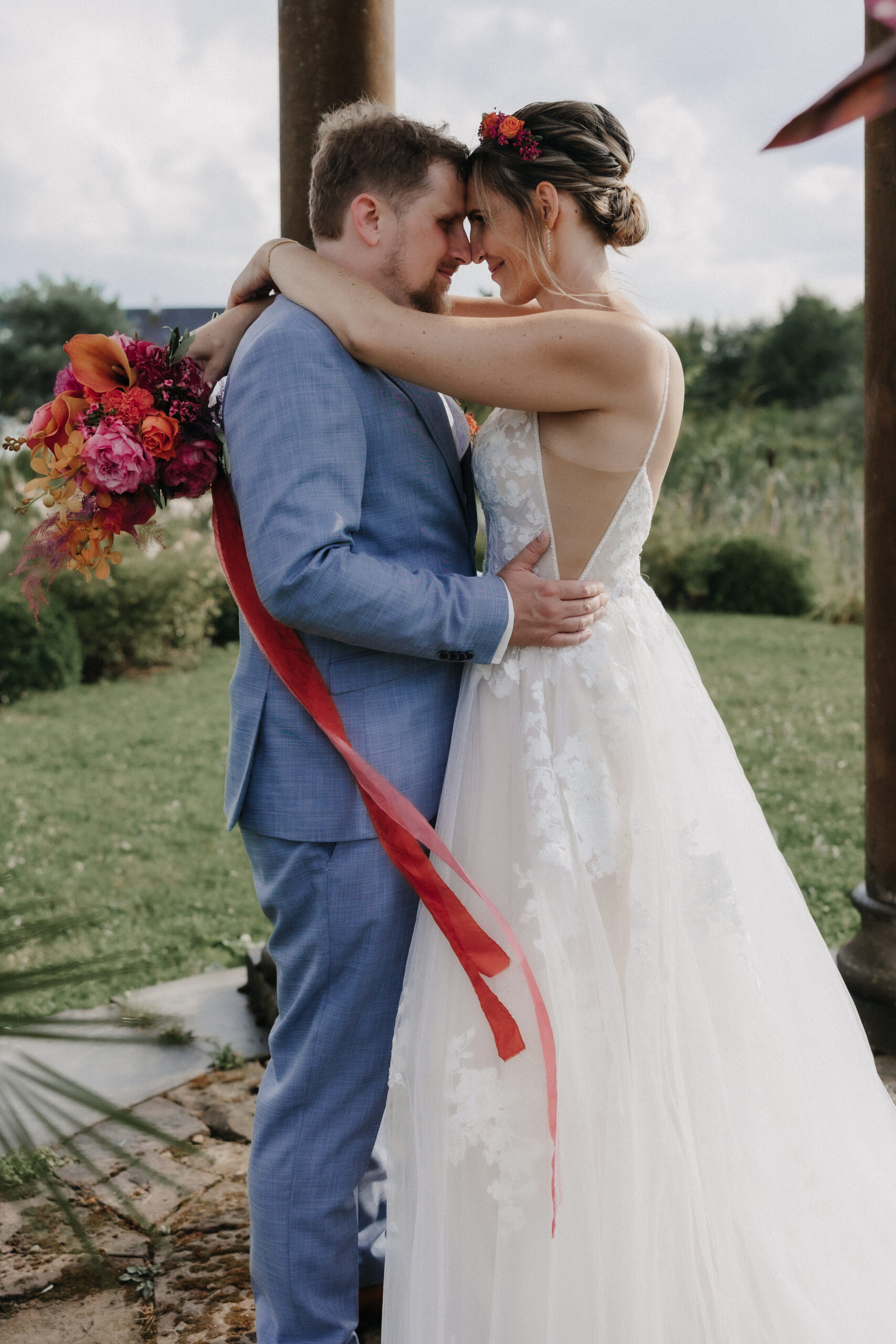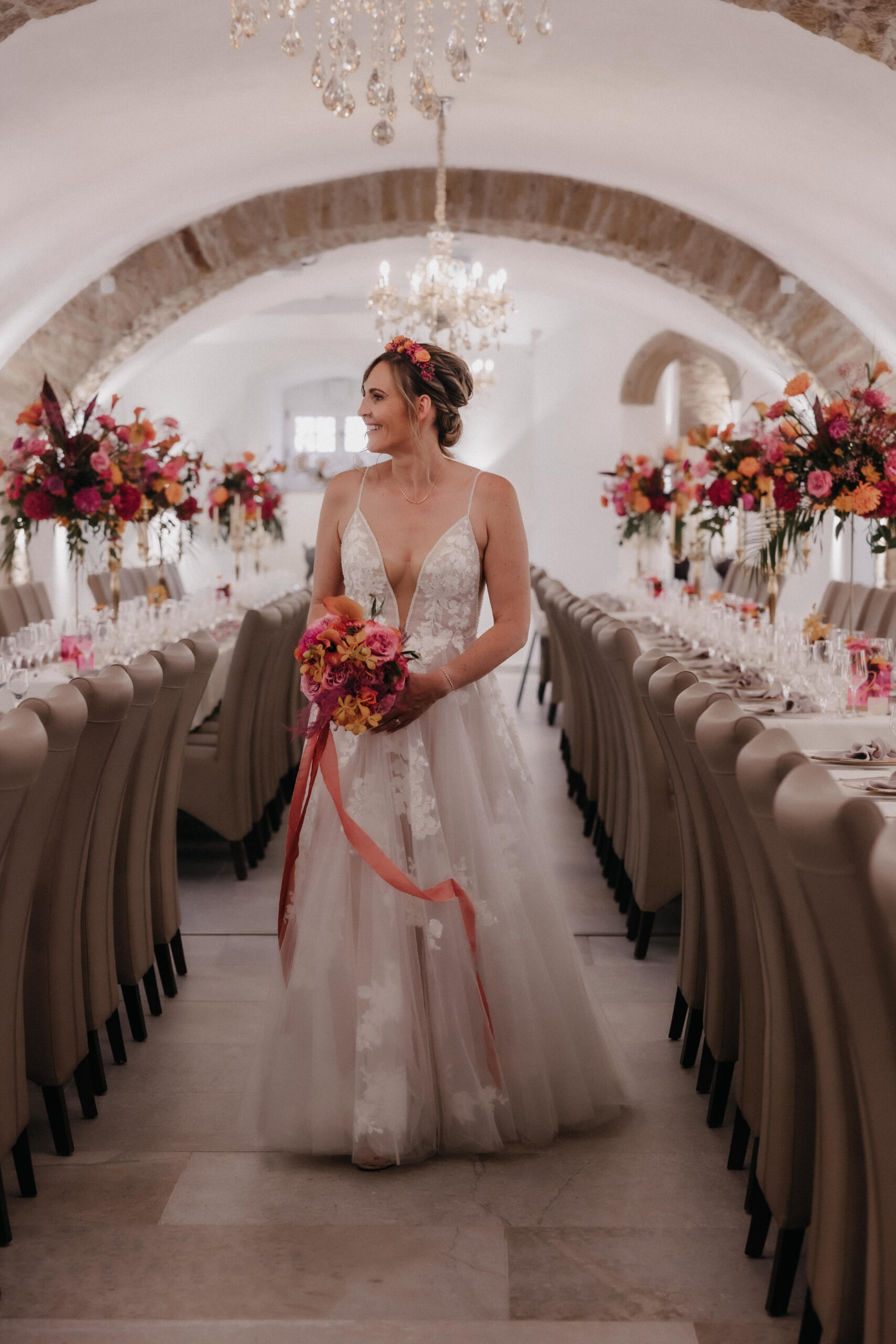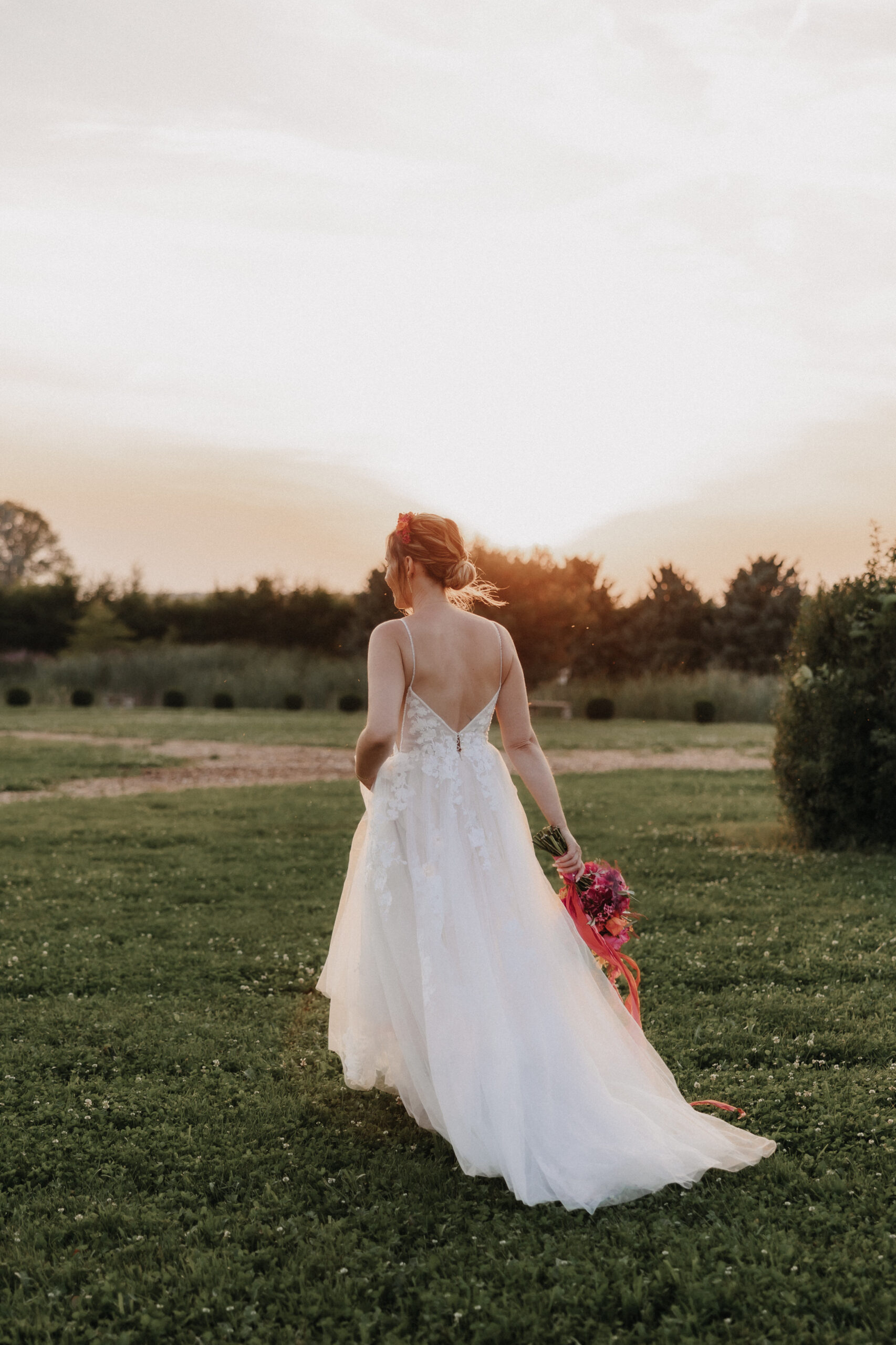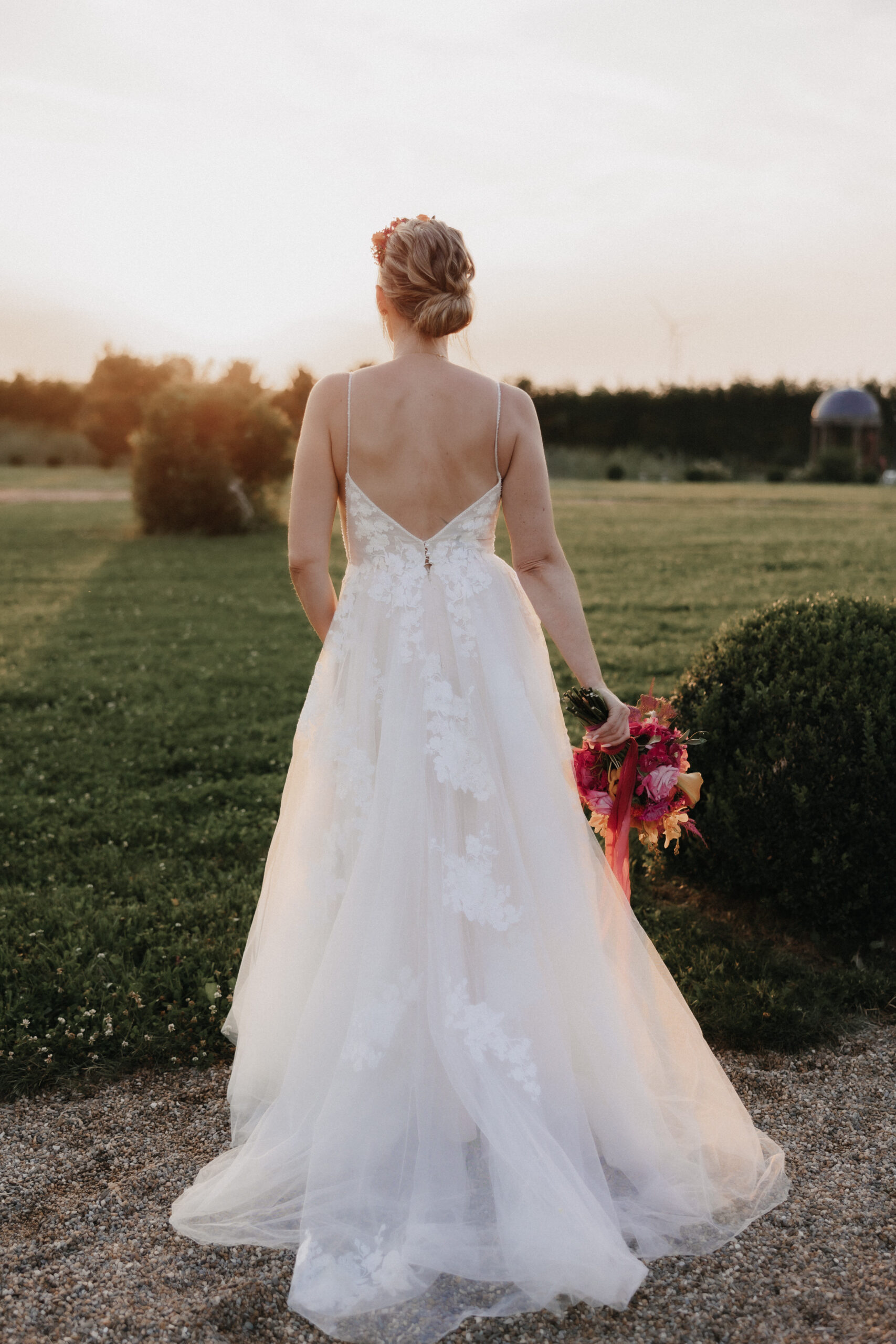 Die Braut trug ein traumhaftes Kleid von OhYes Bridal – modern, elegant und gleichzeitig wunderbar individuell. Das fließende Design und die feinen Stoffe passten perfekt zu ihrer Persönlichkeit und verliehen ihr einen Hauch von Märchenhaftigkeit, der im Zusammenspiel mit der Schlosskulisse einfach magisch wirkte.