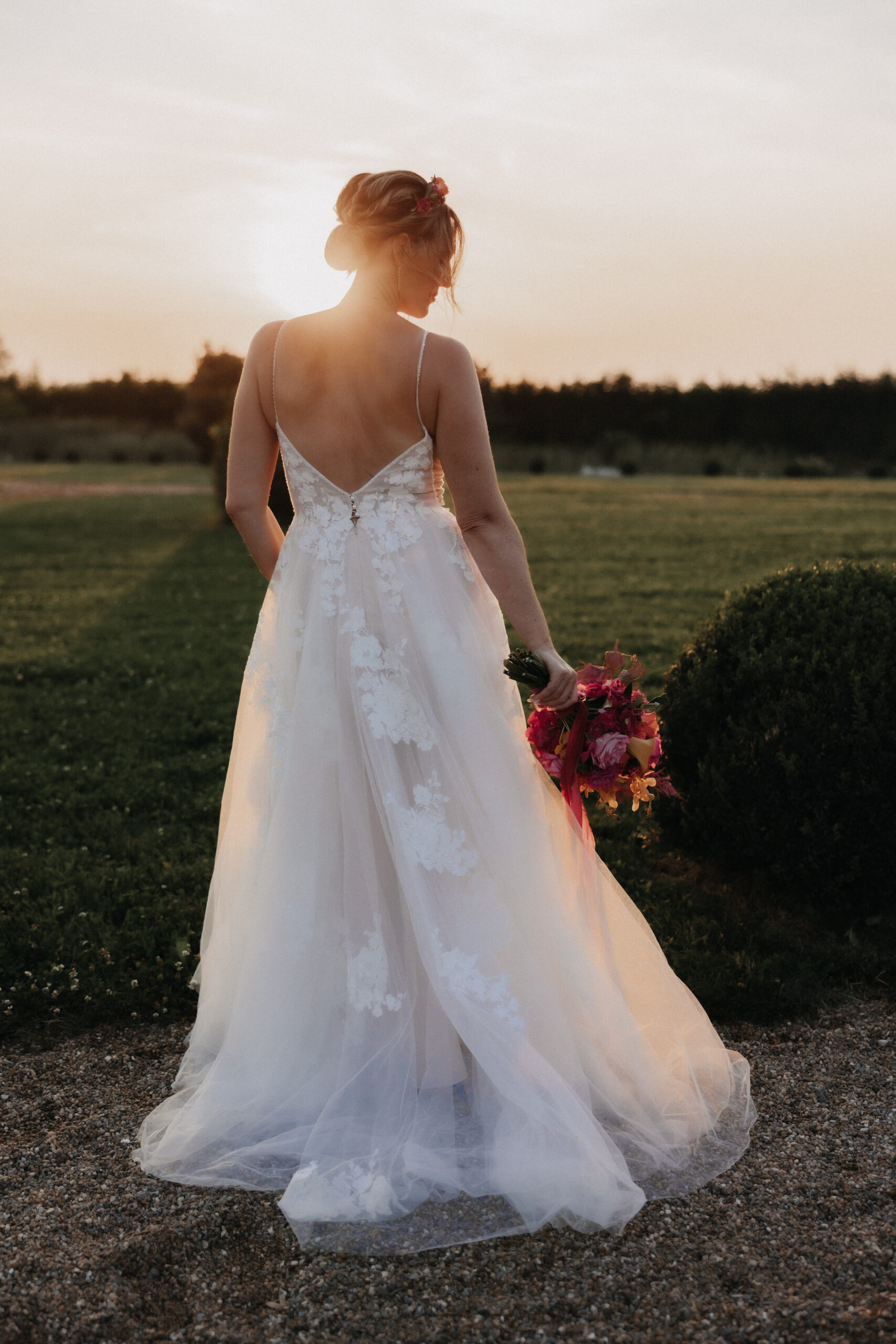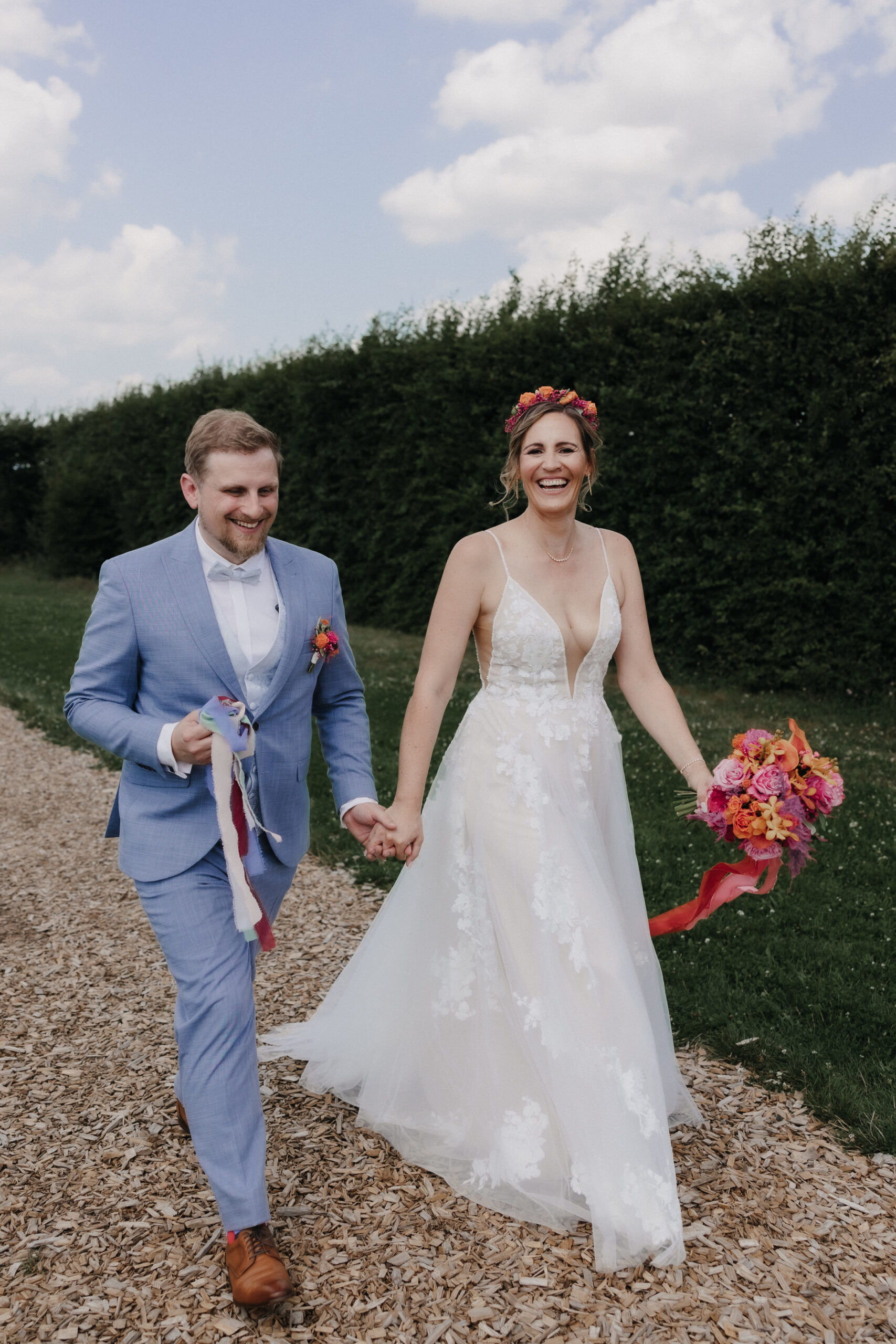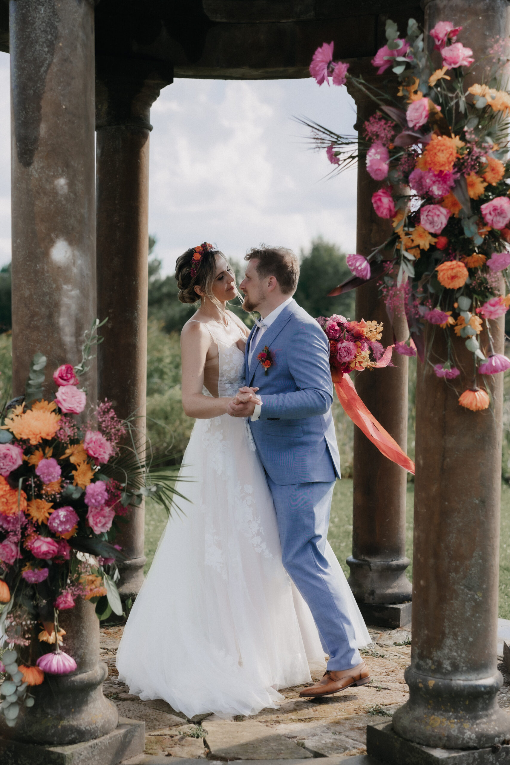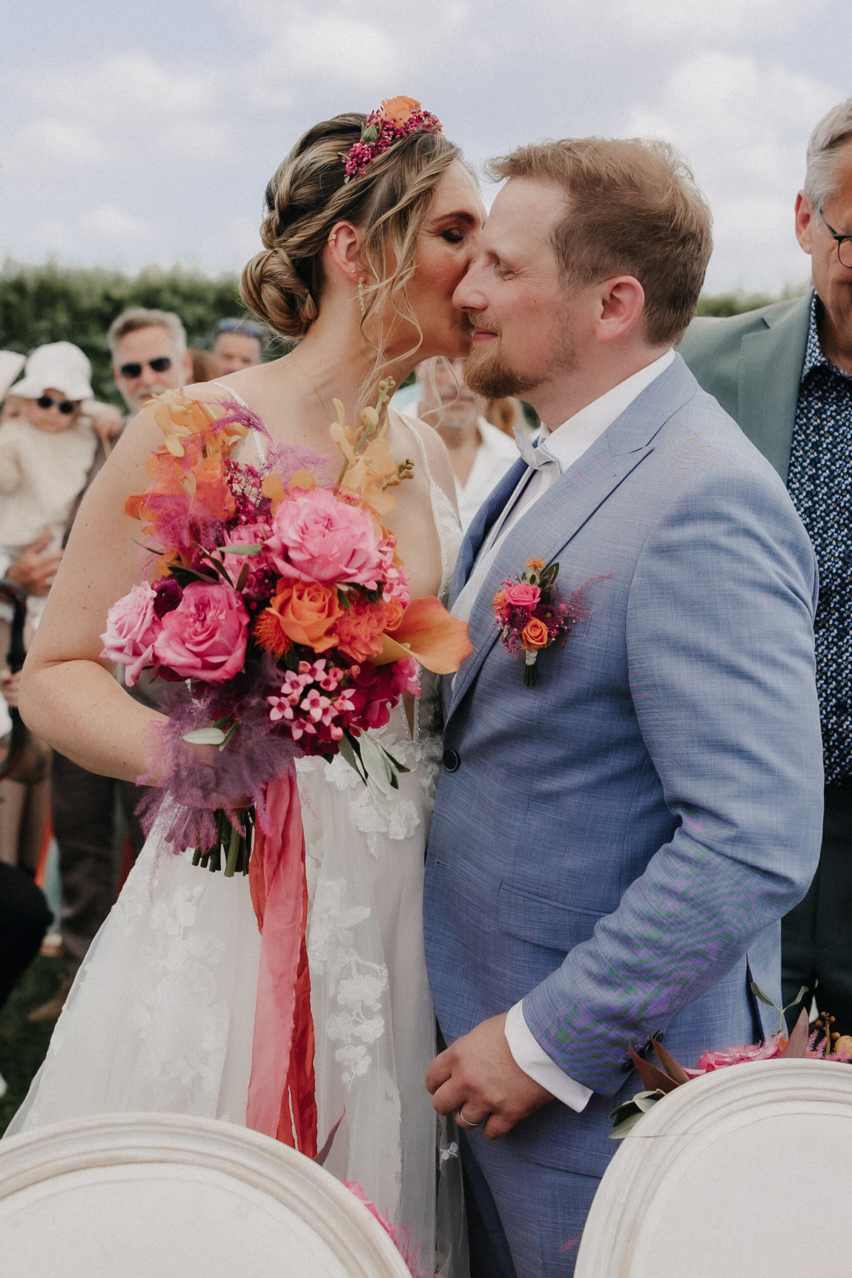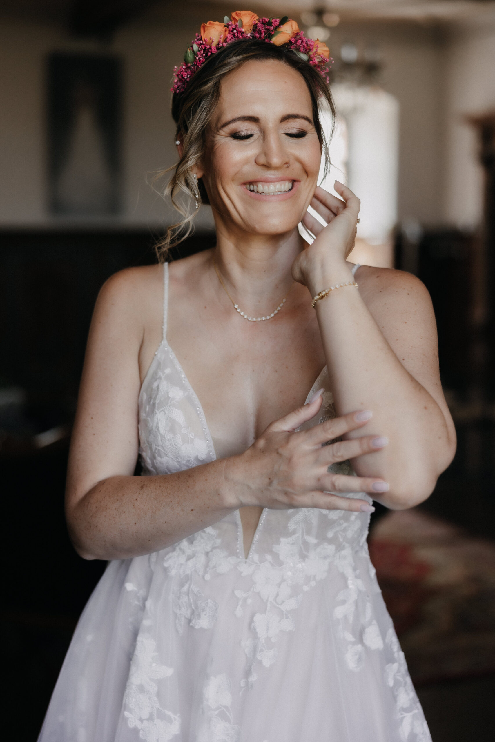 Die Braut trug ein traumhaftes Kleid von OhYes Bridal – modern, elegant und gleichzeitig wunderbar individuell. Das fließende Design und die feinen Stoffe passten perfekt zu ihrer Persönlichkeit und verliehen ihr einen Hauch von Märchenhaftigkeit, der im Zusammenspiel mit der Schlosskulisse einfach magisch wirkte.